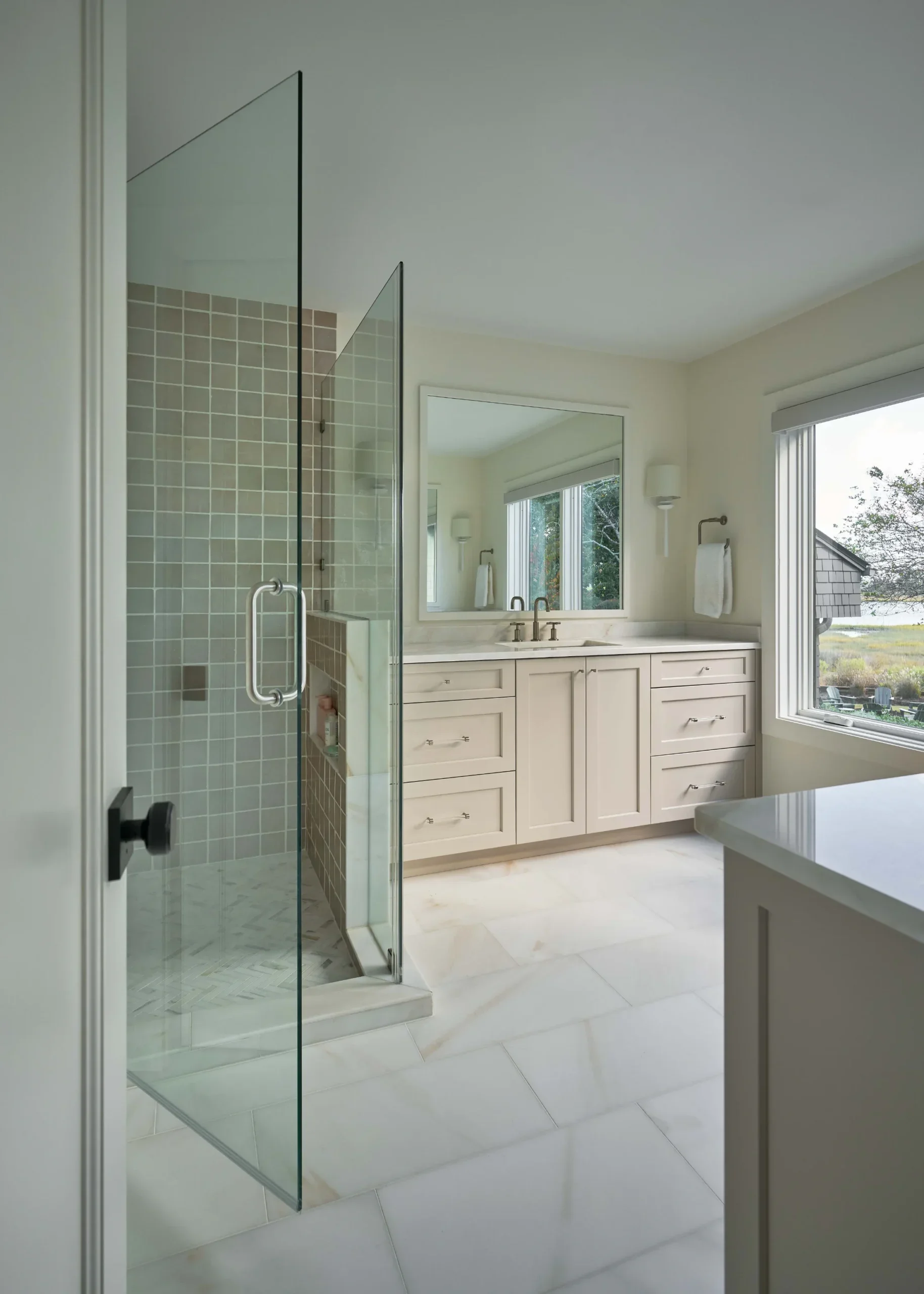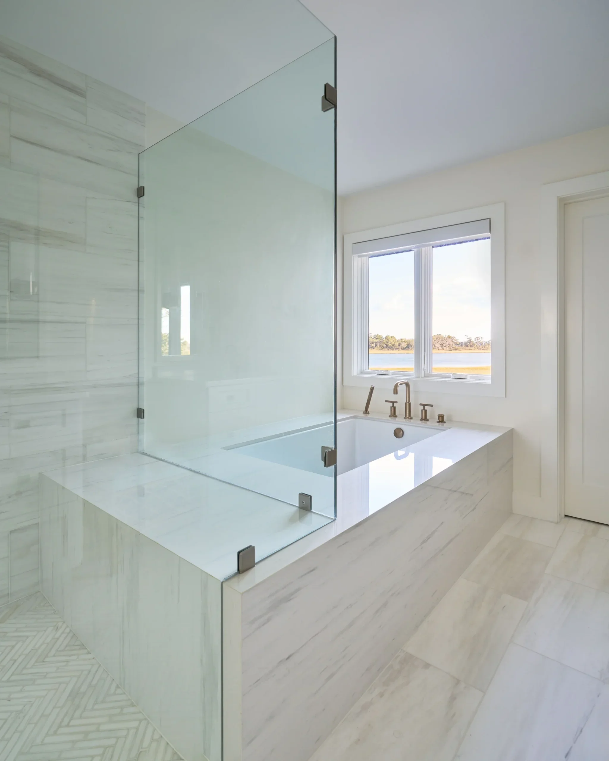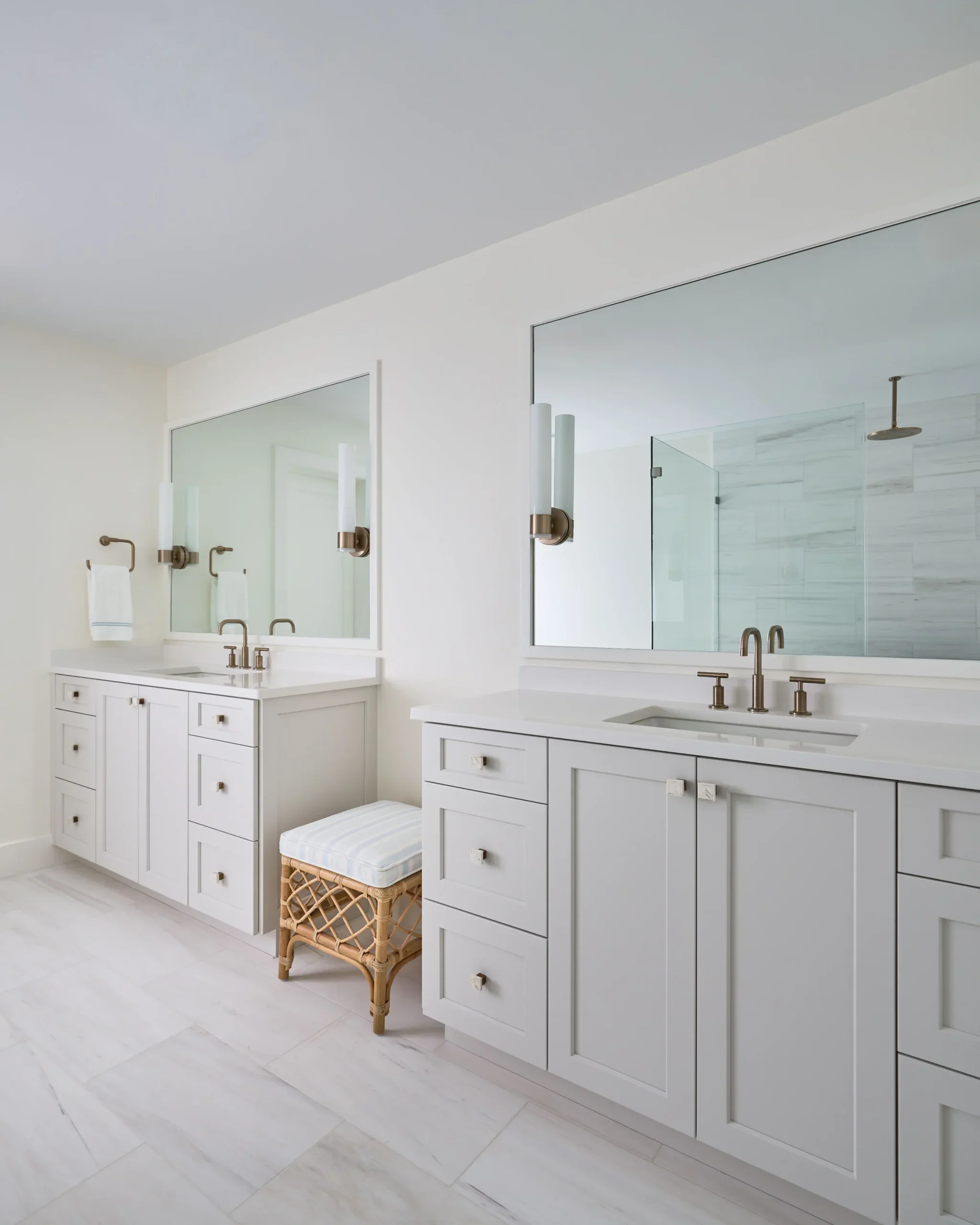 Reimagined to support the client’s lifestyle, these bath renovations open and simplify the spaces, allowing the materials and coastal influence to take center stage. Partnering with the builder, the designs replace dated soffits with open layouts and introduces larger showers for a more functional, elevated experience.